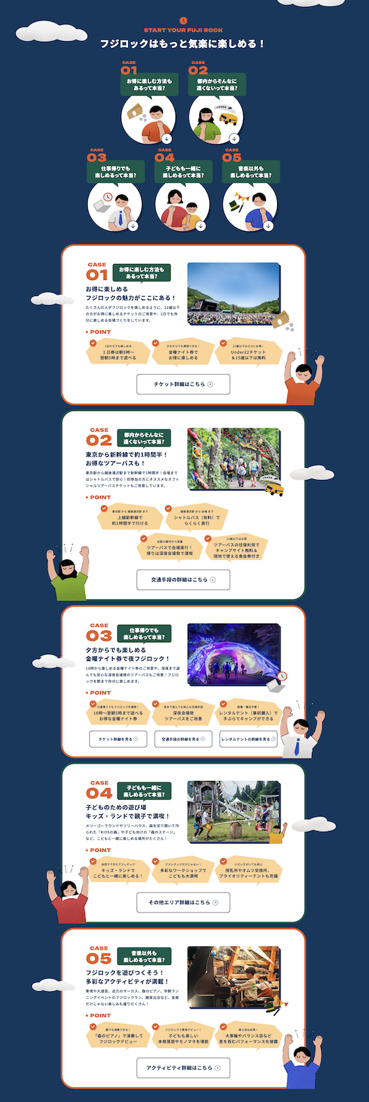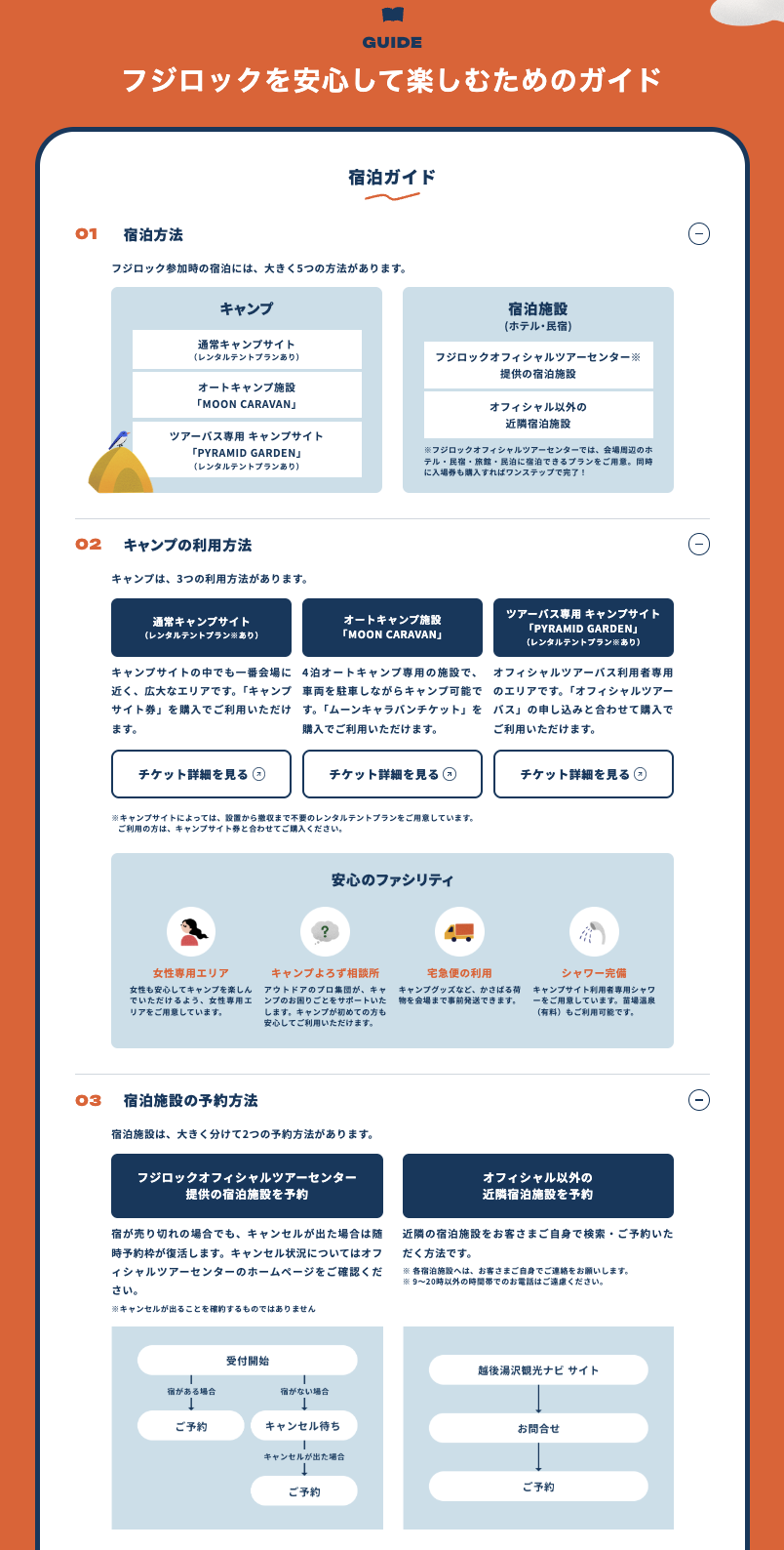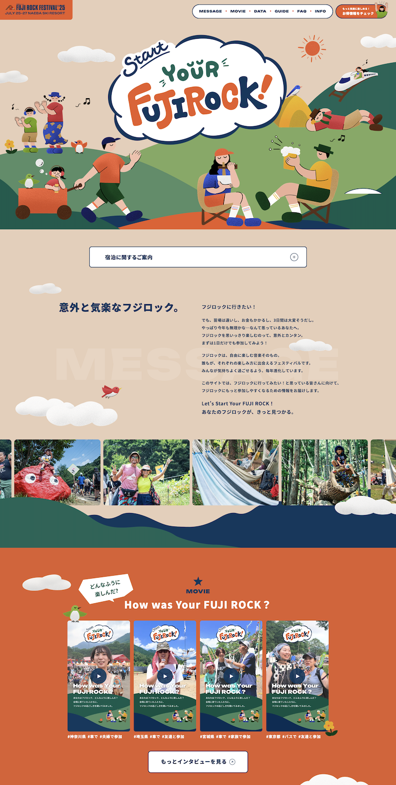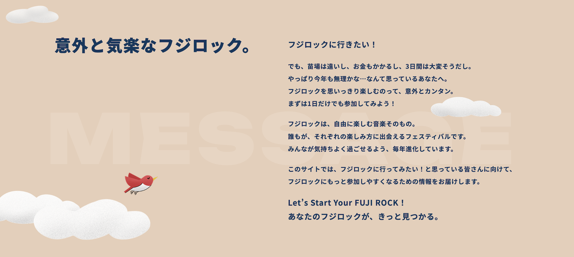 国内外でさまざまな音楽フェスが開催されるようなった中、「フジロックに行ってみたいけど、ちょっとハードルが高そう」と感じているビギナーやライト層の方々に向けて、「意外と気楽なフジロック」をコンセプトに、フジロックを気軽に楽しむ方法を伝えるサイトを制作しました。わわわでは、コンセプトメッセージ開発とサイトネーミング、コンテンツのライティングなどを担当しています。